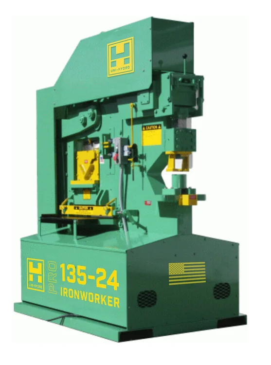 Uni-Hydro takes the business of building mammoth ironworkers to a new level with the PRO 135 and 150 ton models. These hulking machines, are constructed in the same spirit as their forbearers from the Golden Age of machine tools with weldements up to 9” thick, a foot of metal surrounding the punch and weights of almost a ton more than the PRO 125 ton.