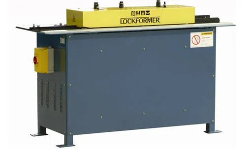 The Button Punch Snap Lock Machines form a two piece seam that greatly simplifies ductwork assembly. The male seam is a button, the female seam is a lock and the two snap together for a flush corner. These machines can form 20 to 26 gauge sheet metal into female locks on the inboard and button punched right angle flanges on outboard rolls at speeds of 60-65 fpm and are available in seven and nine forming station machines. Not only do these locks assemble twice as fast as traditional methods, but because the two pieces nest, they are easier to transport too.