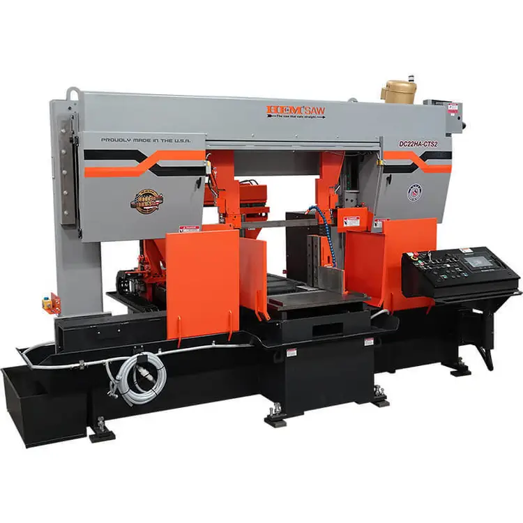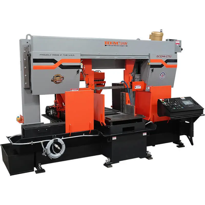 The DC22A band saw operates using a touch screen control mounted in a swing-away console. A 48” servo twin ball-screw bar-feed is standard and a 120” version is optional. A full-stroking main vise positions automatically with the powered guide arm. The Cut Watcher® System and chip auger are standard.