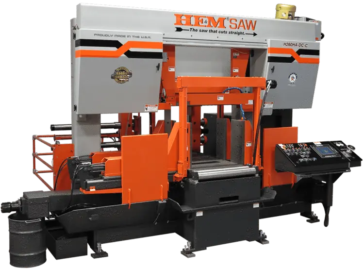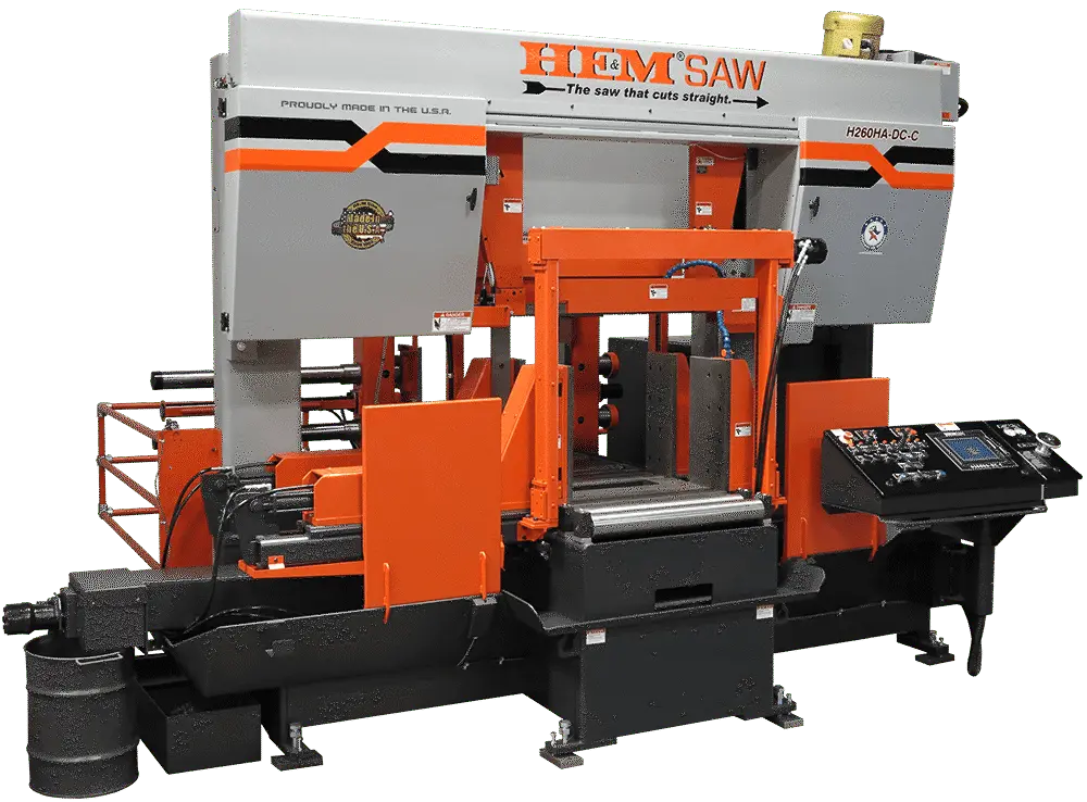 The H260-DC band saw operates using a touch screen control mounted in a swing-away console. A 48” servo twin ball-screw bar-feed is standard and a 120” version is optional. A full-stroking main vise positions automatically with the powered guide arm. The Cut Watcher® System and chip auger are standard.