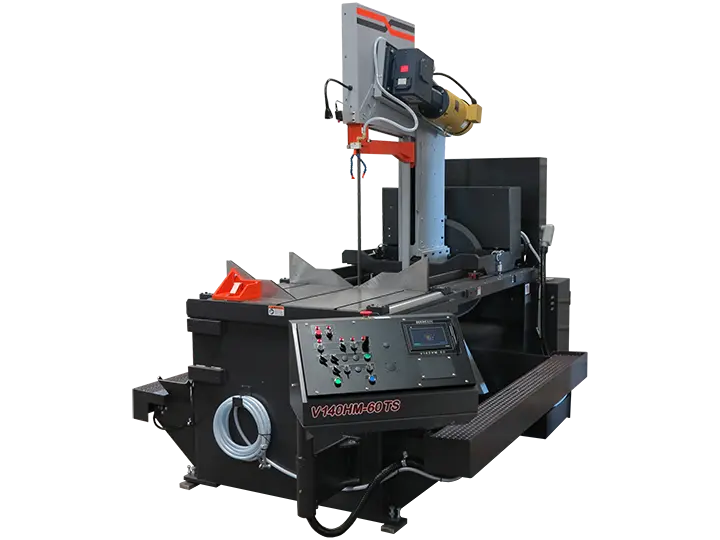 The V140 and VT140HM-60-CTS band saws vary from a vertical blade orientation on the V140 to a forward-canting blade on the VT140 version. The touch screen control, mounted in a swing-away console, allows the operator to enter an angle and the arm will travel to that position and stop.