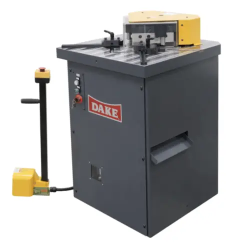 This corner Notcher has a 6mm or 4-gauge mild steel capacity, so it can make quick work of most any job. The DLN-6200 sheet metal corner Notcher machine has blades that are fixed at 90°, ensuring a perfect notch every time. A 25.5” x 25.5” oversized working table includes table guides, for even more accuracy. The DLN-6200 sheet metal Notcher machine has 8.5” long blades that can be resharpened many times for even more life The blades have a negative rake to pull the material to the stops during the cut, for the best accuracy available. The DLN-6200 sheet metal Notcher comes with a powerful 4HP 220V 3 phase motor and operator-controlled foot pedal that is capable of 15 strokes per minute.
