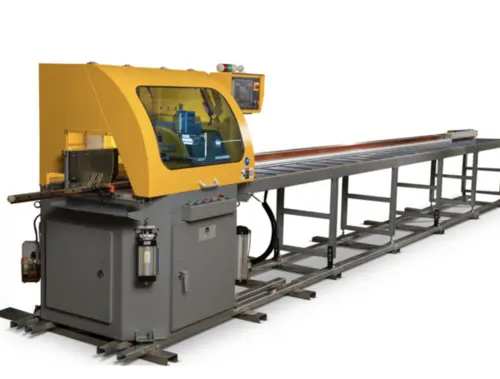 The PMI-20 36 CNC Auto Miter Upcut Saw is a fully automatic upcut miter saw that is built and designed to cut aluminum extrusions, profiles, and other non-ferrous materials (copper, brass, plastics).