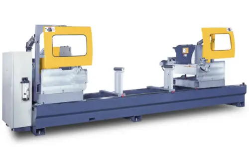 The PMI-T3 CNC Automatic Double Head Miter Saw is built and designed to cut aluminum extrusions, profiles, and other non-ferrous materials (copper, brass, plastics).