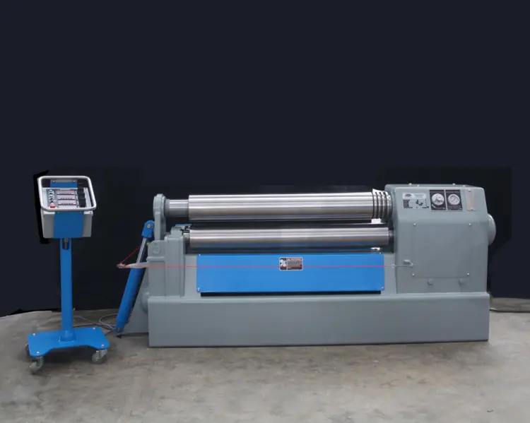 The WDM K series hydraulic initial pinch plate bending machine; models K-5 to K-12 are well designed, robust machines that feature a wedge actuated pinch roll positioning system. This provides for an accurate and parallel pinch roll position. The rear bending roll is positioned with heavy duty master and slave hydraulic cylinder arrangement. The accurately machined rolls turn on sealed spherical roller bearings with extended maintenance period of five years or more, in most cases. The heavy fabricated steel main frame contains a hydraulic reservoir for a quiet integrated hydraulic system. In designing the system, much attention is given to the efficiency of components which results in a cool operation. The Beta 3.2 roving pendant control with pushbutton controls and DRO's to show position of the rolls comes standard. If however you prefer a more sophisticated machine we offer many options and enhancements in control styles and position indication. If you have a special need beyond this we are glad to accommodate it.