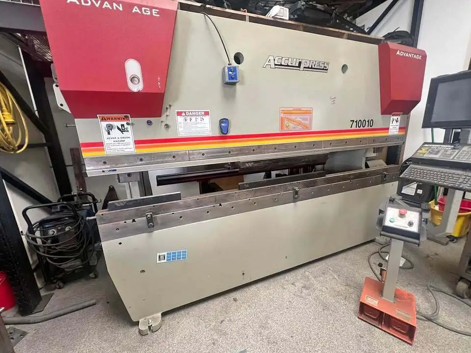 2014 Accurpress Advantage Model 710010 Press Brake, with 10' x 100 Ton capacity, ETS 3000 control system, Wilson hydraulic express rail clamping, dual encoders, has ETS3000 CNC Control With Premium 24" X And R Powered Backgauge.