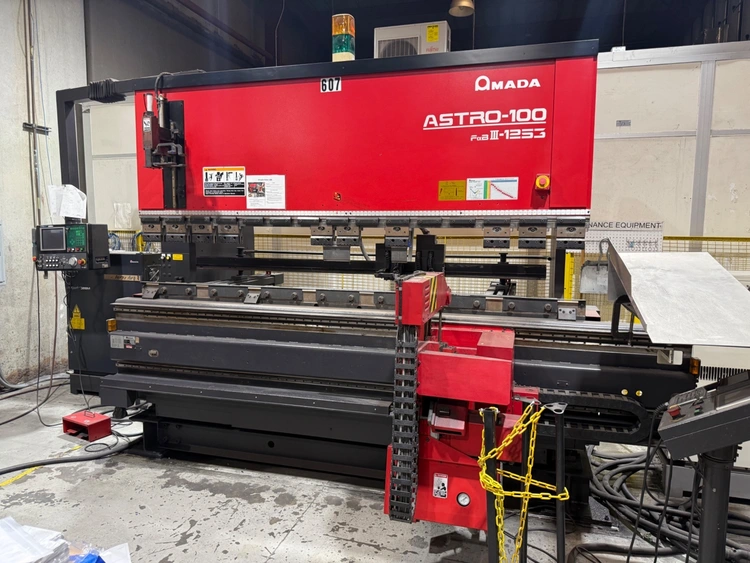 The Amada Astro-100 FBD-1253MH is a 125-ton hydraulic press brake with a 122-inch bed length. It has a 5.9-inch stroke length, a 16.5-inch open height, and a 106-inch distance between housings. The machine is equipped with an Astro-100 robotic bending system.