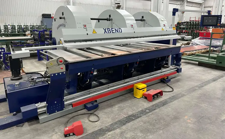 Bradbury Biegemaster XBend Double Folder with 122" x 14 GA Capacity, Touchscreen Controller, part library, ability to draw profiles and modify saved or newly created parts. Includes Servo driven hydraulic pump for quick operation of the folder, angled clamping beam for forming various profiles on the folder, and Fully Automatic Back Gauge.